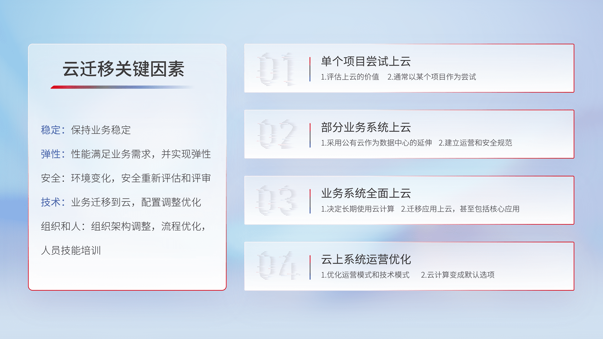 结合实际业务,,,从规划设计、、、云平台选型、、云原生改造、、、、数据迁移、、、集成交付,,,迁移全过程为客户识别最佳上云路径,,,做好风险识别管理,,,设计网络架构、、身份权限、、、、安全审计合规、、、操作审计、、日志审计、、、、监控告警策略、、多站点容灾设计等,,,对云上基础设施进行整体规划,,提升IT治理水平,,以满足弹性、、、高可用、、、、高性能的需求。。。。