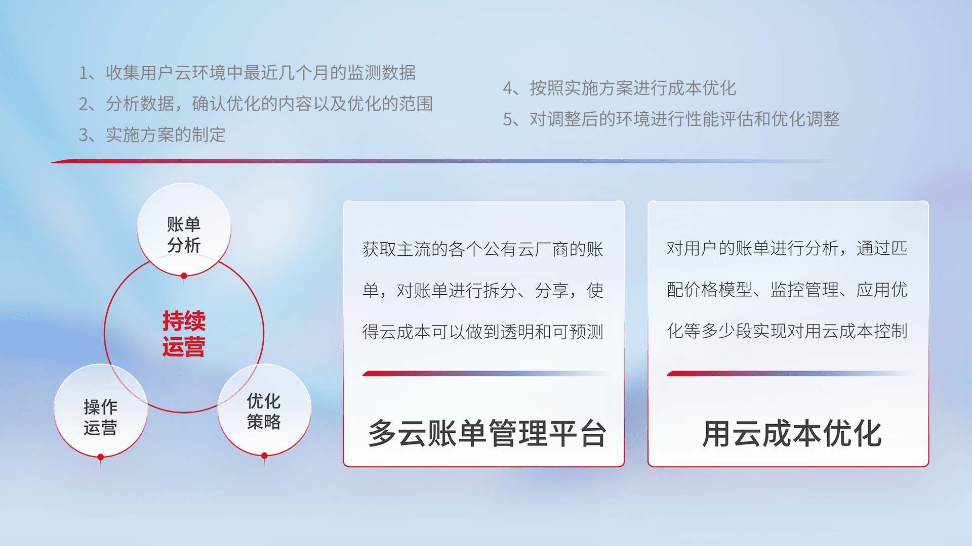 通过多云纳管,,以统一的资源数据模型把客户的云资源进行抽象和封装,,进而实现对多云资源的统一操作,,,,保障云资源管理的可靠性、、稳定性与可用性。。。量身定制化运维内容,,,配置、、、、开发运维、、补丁管理、、、备份、、、、监控、、、、认证和访问管理、、、、审计和日常巡检等,,,保障在用云过程中的可靠度,,稳定度以及高可用率。。。